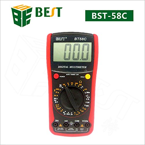 PRODUCT DESCRIPTIONS:BST-58C Digital MultimeterBEST-58C is a new generation 3 1/2 digital multimeter with big LCD screen,which can be used to test voltage alternating and direct current,alternatiing and direct current,resistance,electrical capacity,electrical inductance,frequency,temperature,triode transistor,magnification,forward voltage drop of LBD and onoff warning.It has many functions,such as data hold,auto power off,low voltage display. Characteristics:New style shake proof cap,streamline design,comfortable,hand feeling. Large screen with high articuation display.excellent anti-jamming capability.Coplete protection function,strike fire circuit design for anti high voltage.