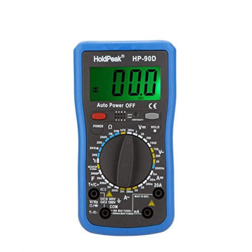 PRODUCT DESCRIPTIONS:The meter is able to measure AC/DC voltage, current, resistance, frequency, capacitance, temperature, transistor, battery, continuity and diode.Features:AC/DC voltage, current, resistance, frequency, capacitance, temperature, hFE, battery testContinuity buzzer and diode testDisplay: 3 1/2 digits LCD display, with a max. reading of 1999 countsLCD backlight displayAuto zeroOverload protection: full range protectionData hold functionLow battery displayOver range display (“O L”)Automatic power offSpecifications:DCV: 200m/2/20/200V ±0.5%; 1000V ±1.5%ACV: 20/200V ±1.5%; 750V ±2.5%DCA: 2m/20mA ±0.8%; 200mA ±1.2%; 20A ±2%ACA: 2mA ±1.0%; 200mA ±2.0%; 20A ±3.0%Ohm: 200¦¸ ±1.2% ; 2K/20K/200K¦¸ ±0.8%; 2M/20M¦¸ ±2.5% Freq.: 200KHZ ±3.0%Cap.: 2000p/20n/200n/2u/200uF ±2.5%Temp.: -20¡æ¡«1000¡æ ±3%Battery Power Test: ≤12 ±1.5%General Characteristics:Power Supply: 1 * 9V/6F22 (not included)Dimensios: 163 * 88.5 * 50mmItem Weight: 320gPackage Size: 23 * 15 * 7cm / 9 * 5.8 * 2.7inPackage Weight: 572g / 1.3lbPackage List:1 * HoldPeak HP-90D Digital Multimeter1 * Pair Test Lead1 * Pair Alligator Clip (Black & Red)1 * Temperature Probe1 * English Manual1 * Carrying Bag