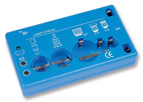 A compact lamp tester for a wide range of miniature lamp types including B15d, B22d, E10, E14, E27, G4, G5, G9, G13, G53, GU5.3, GU10, GY6.35. The tester gives audible and visual indication. Supplied with 9V PP3 battery.