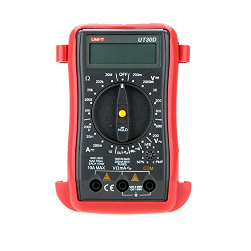 PRODUCT DESCRIPTIONS:Features: Transistor: √Diode:√Continuity Buzzer: √Square Wave Output: √Low Battery Display: √Input Impedance for DC Voltage Measurement: 10M¦¸ Data Hold: √Max Display: 1999 Display Backlight: √Specifications:Model: UT30DDC Voltage (V): 200mV/2000mV/20V/200V/500V ±(0.5%+2)AC Voltage (V): 200V/500V ±(1.2%+10)DC Current (A): 2000uA/20mA/200mA/10A ±(1%+2)Resistance (¦¸): 200¦¸/2k¦¸/20k¦¸/200k¦¸/20M¦¸ ±(0.8%+2)General Characteristic:Product Net Weight: 160gProduct Size: 130mm * 74mm * 41mmPower:9V Battery£¨6F22£©£¨included)LCD Size: 48mm *16mmProduct Colour: Red and GreyPackage Size: 14.5 * 13* 5.5cm / 5.8 * 5.1* 2.2inPackage Weight: 376g / 13.3ozPackage List:1 * UNI-T UT30D Digital Multimeters1 * Test Lead1 * English Manual
